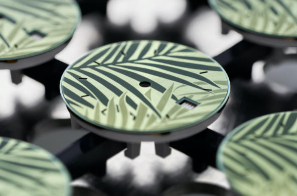 Each of the dials is first radially brushed before the motif is applied with a femtosecond laser – essentially a ultrafast laser that lightly burns the surface of the dial to create the pattern and texture. As a result of the high-tech process, the dials are impressively nuanced – the palm motif is executed in two contrasting shades that provide an impression of depth and shadow.