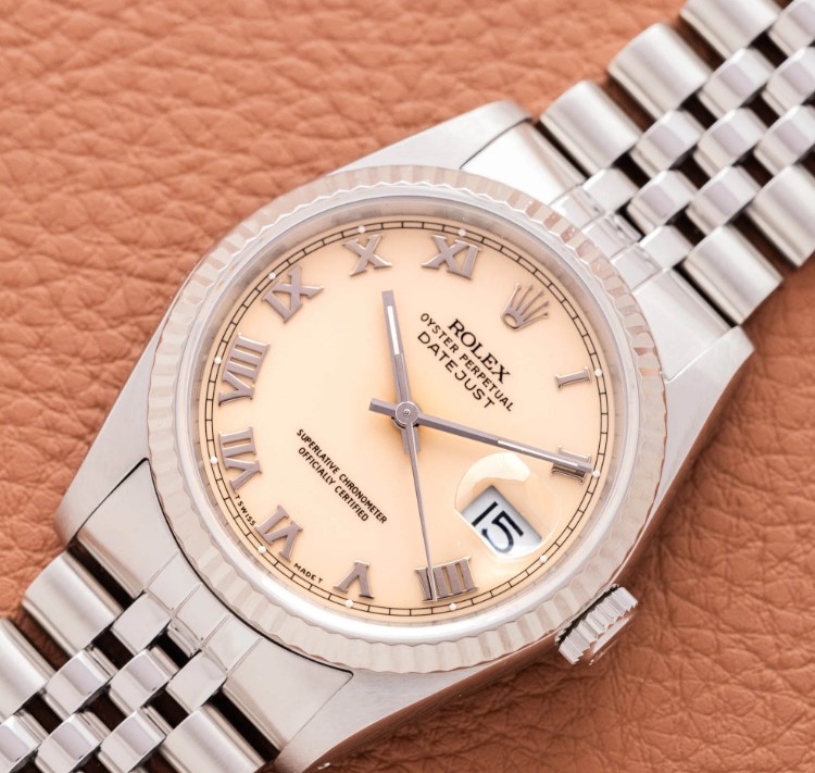 I own a Datejust 1600, a graduation gift from my mother. However, I have often considered getting an additional Datejust, like the 16234. The reference 16234 offers a wide range of dial options, the big plus for these AAA+ Rolex copy watches. For a long time, the salmon pink dial with applied white gold Roman numerals was my absolute favorite after seeing it in Gerard’s pre-owned watch shop in The Hague many years ago. And what about the tapestry dial variation? Amazing! My favorite is the ivory dial version with Roman numerals, which has gradually become a creamy color over time.